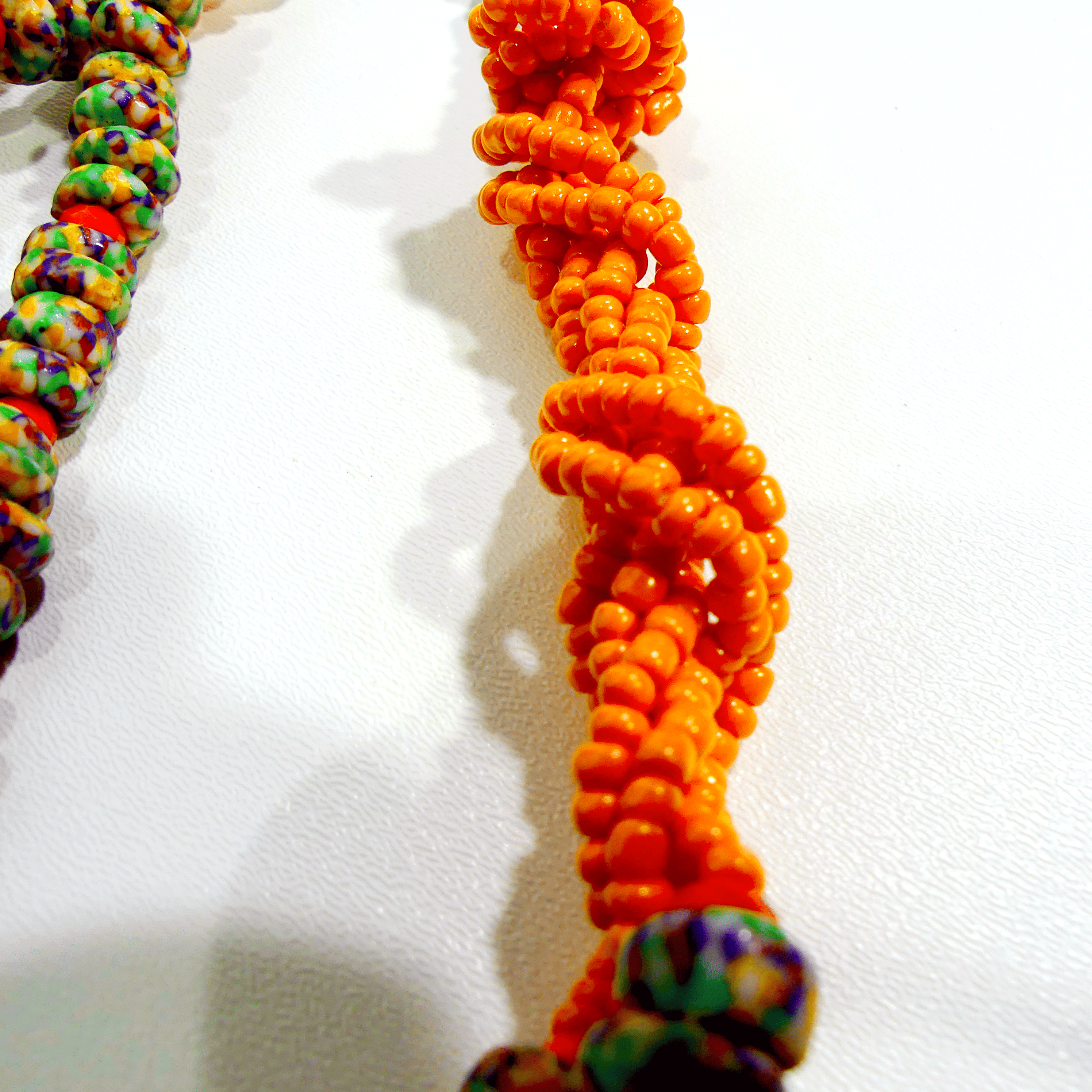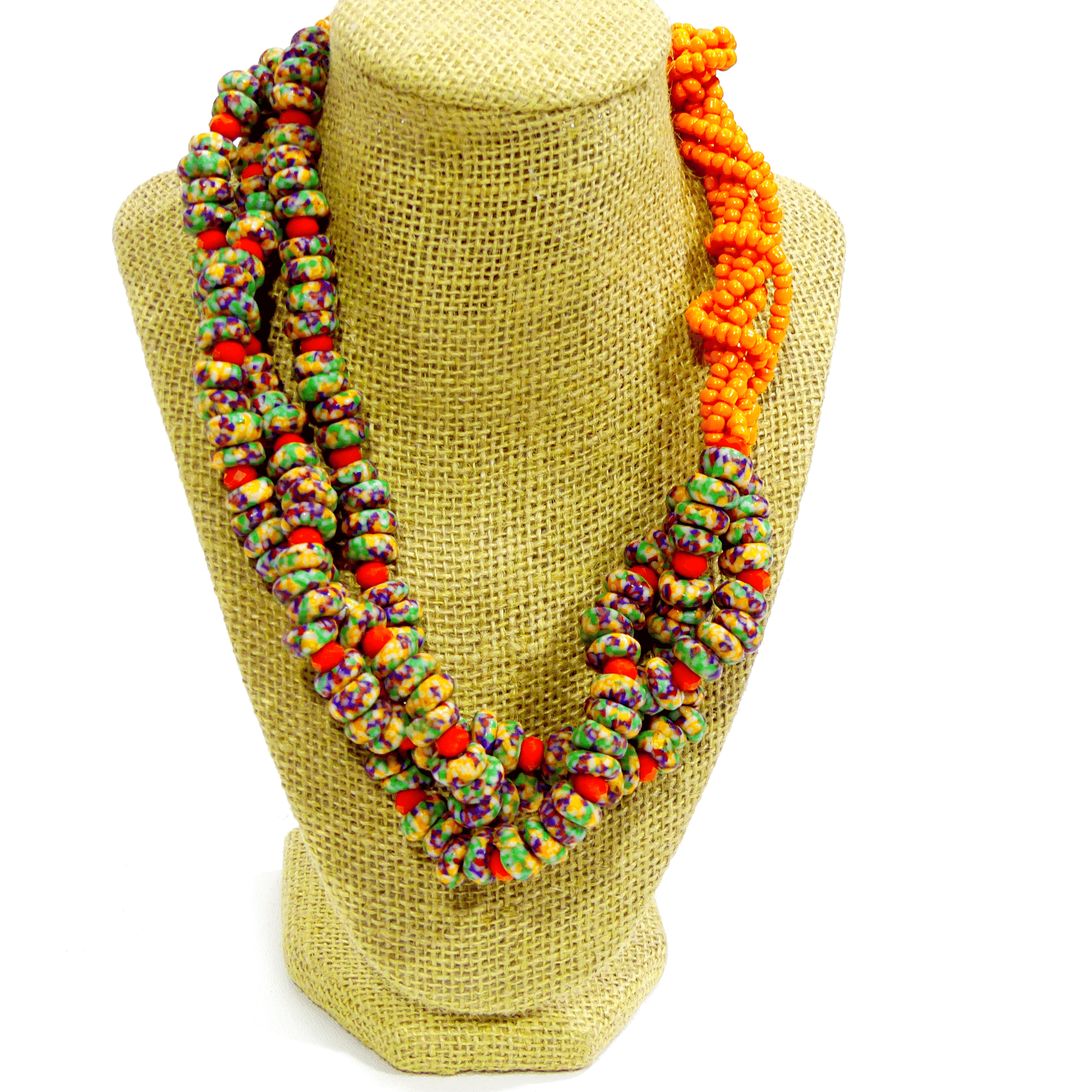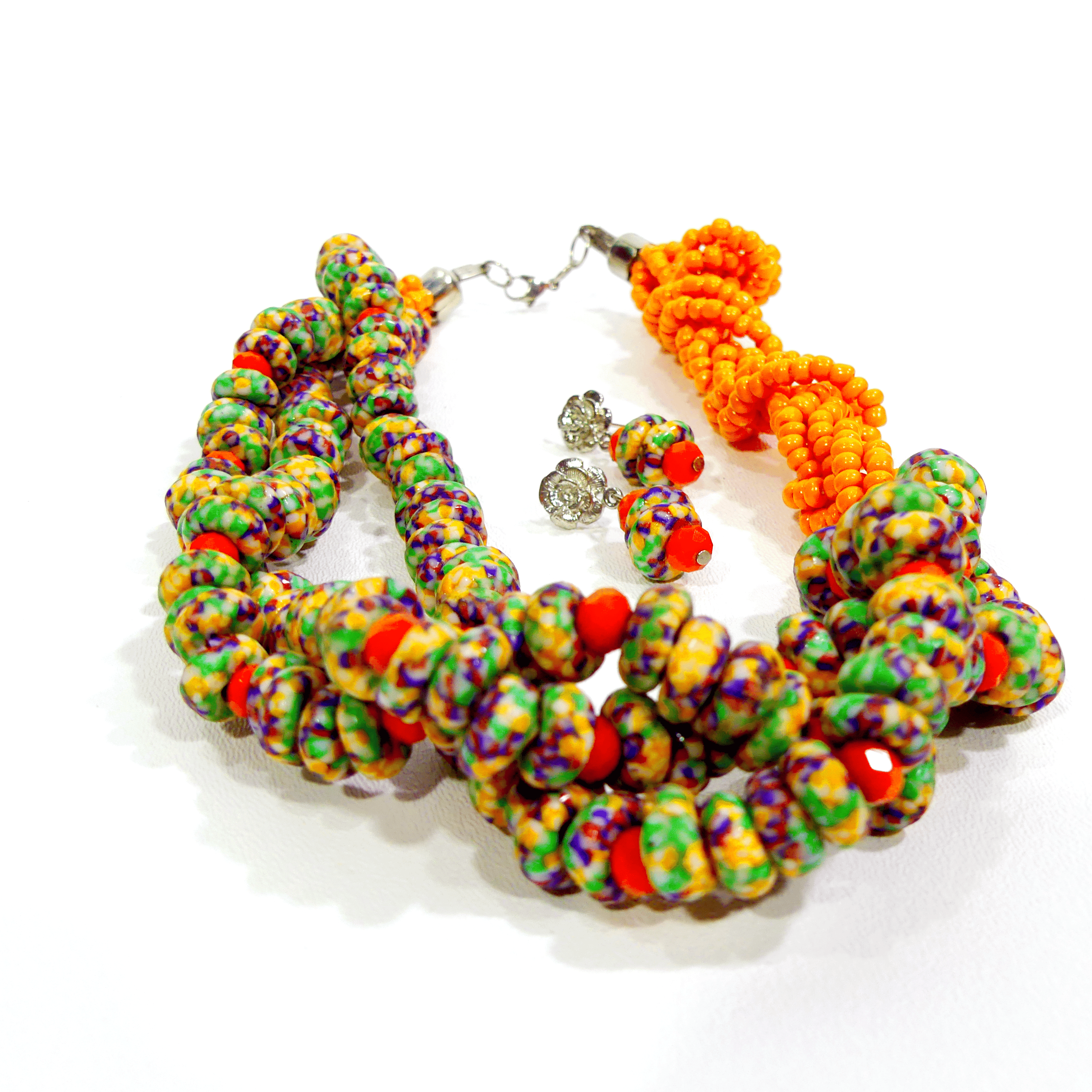 This handmade twisted necklace features a beautifully braided design, skillfully crafted with a combination of beads or gemstones in rich, complementary colors. The twist adds a dynamic texture to the piece, while the end sections feature a striking contrast with beads in a different color, creating a bold, eye-catching effect. Paired with matching earrings that echo the same color variation, this set offers a harmonious yet unique look. Each piece is meticulously handcrafted, ensuring exceptional quality and individuality. Perfect for adding a pop of color and style to any outfit, this set is an elegant statement piece for both everyday wear and special occasions.