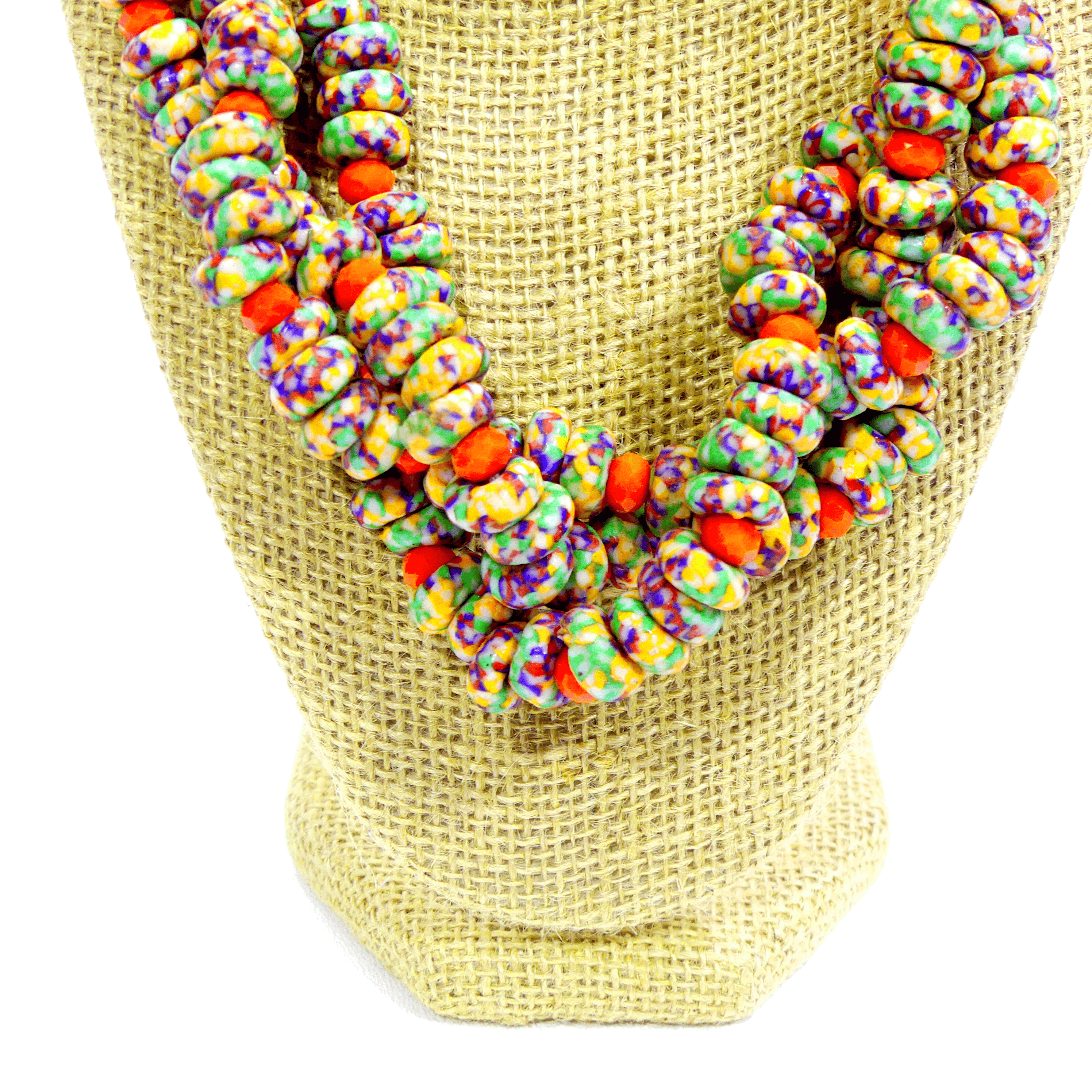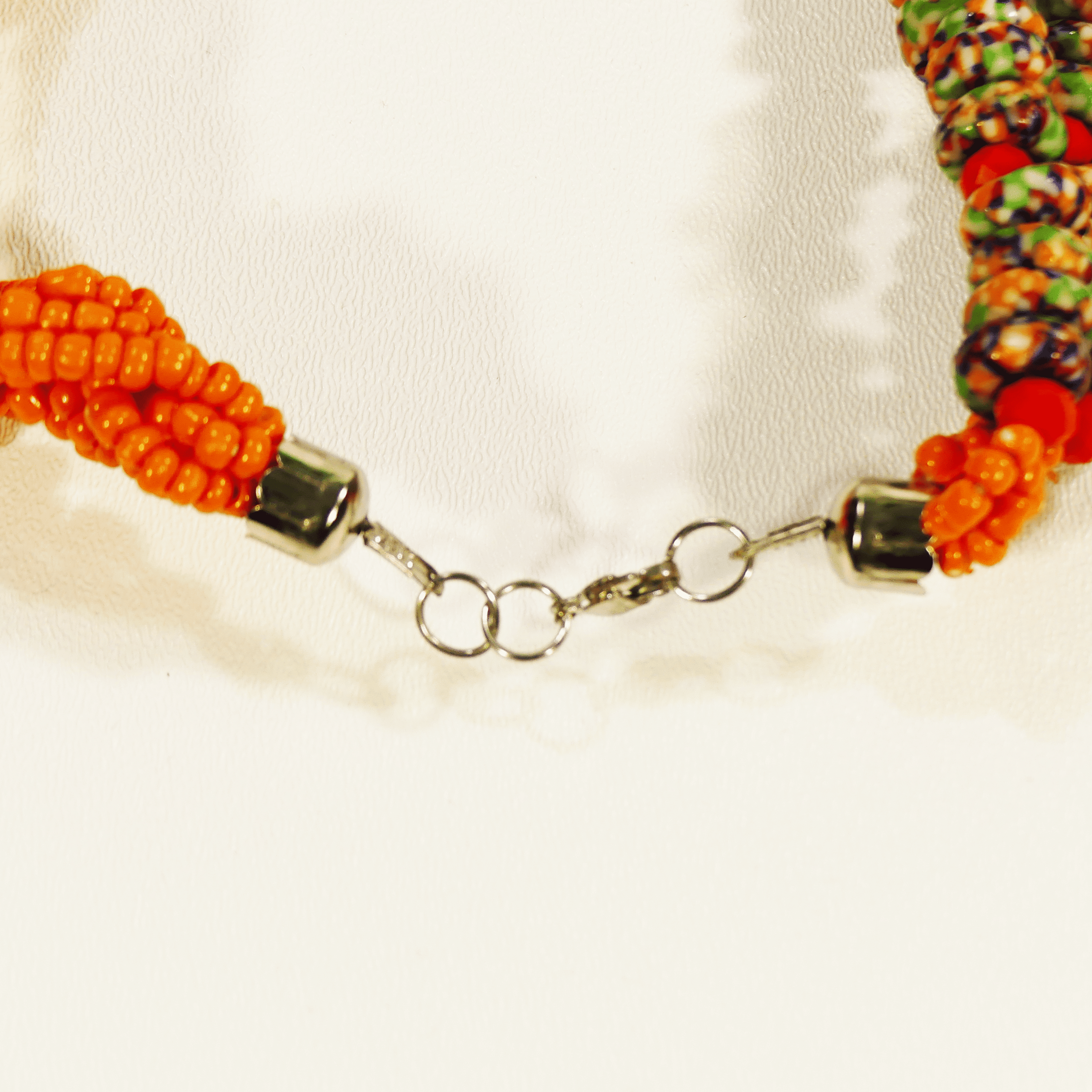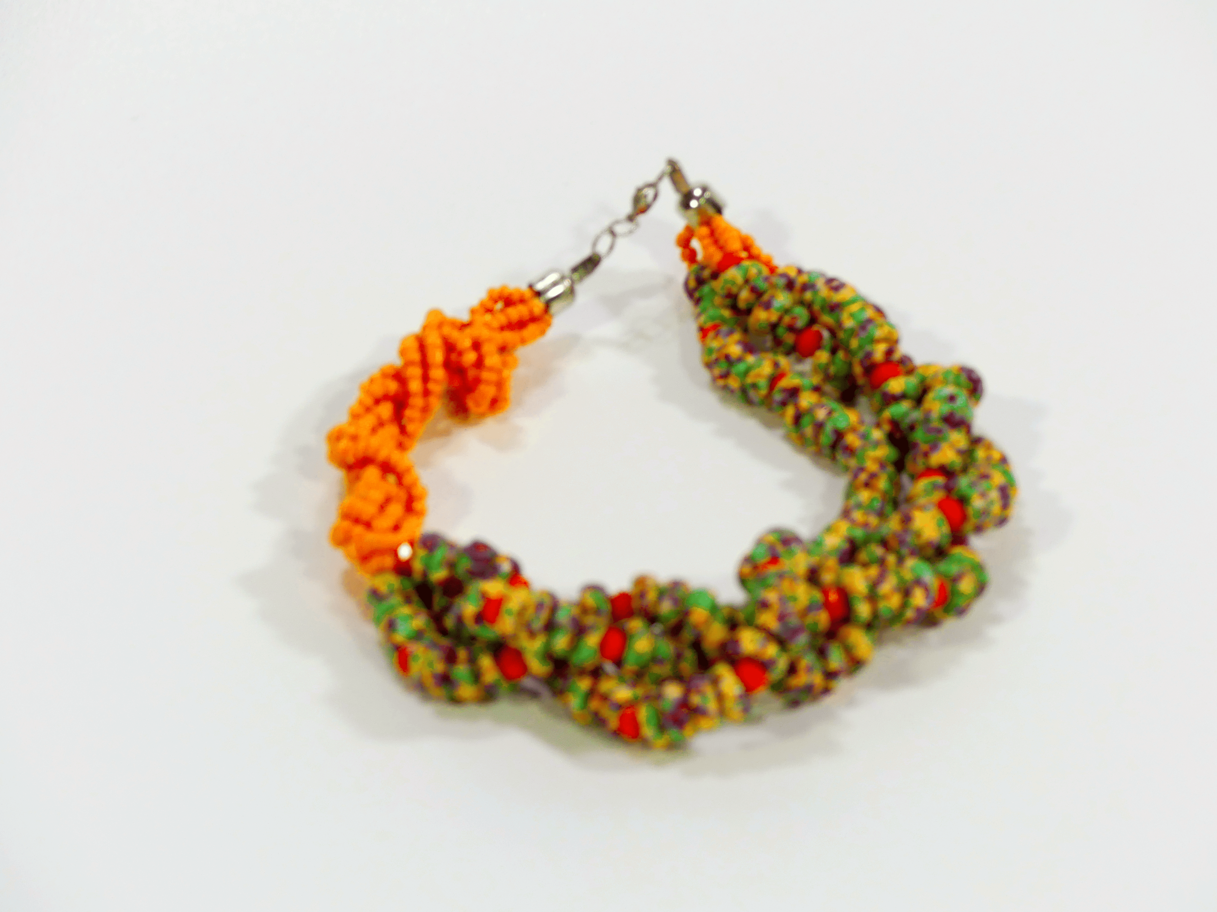 This handmade twisted necklace features a beautifully braided design, skillfully crafted with a combination of beads or gemstones in rich, complementary colors. The twist adds a dynamic texture to the piece, while the end sections feature a striking contrast with beads in a different color, creating a bold, eye-catching effect. Paired with matching earrings that echo the same color variation, this set offers a harmonious yet unique look. Each piece is meticulously handcrafted, ensuring exceptional quality and individuality. Perfect for adding a pop of color and style to any outfit, this set is an elegant statement piece for both everyday wear and special occasions.